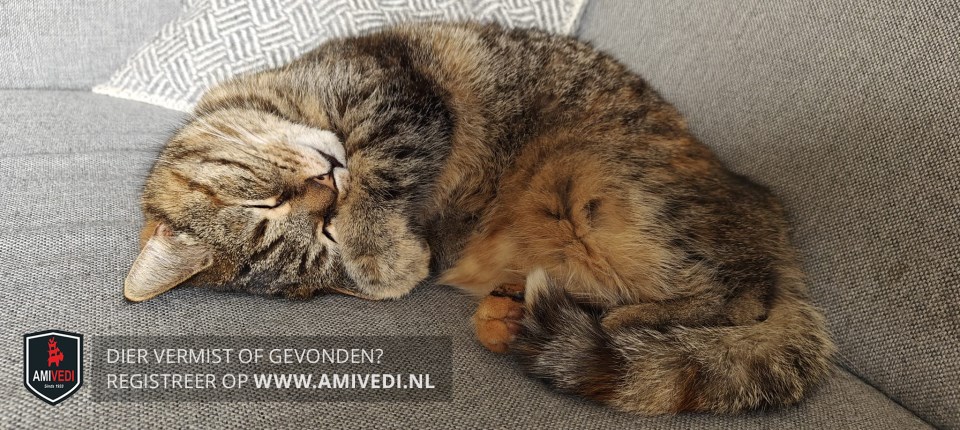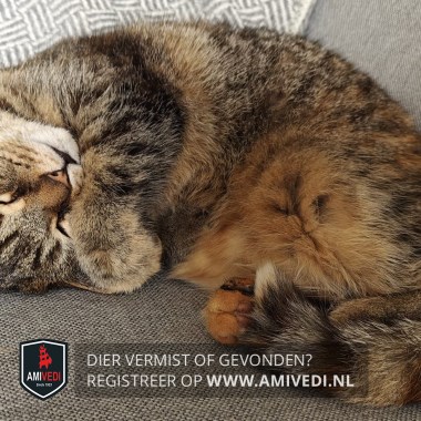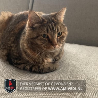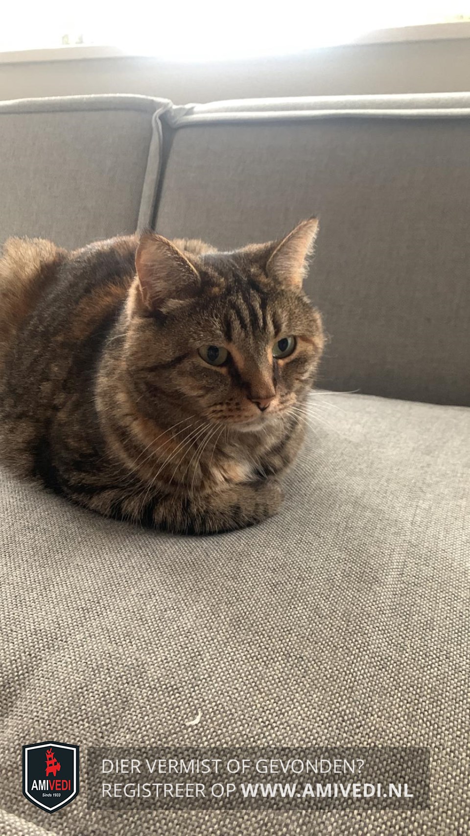 | Signalement | Cypers bruin/zwart gestreept. Kin lichter. Klein wit vlekje op de bef. Puntje van de staart wit. |