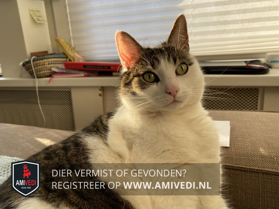 | Signalement | Cypers gestreept / gestippeld in de kleuren bruin, zwart en wit. De pet heeft verticale zwarte en bruine strepen. De bles is wit en loopt uit naar het voorhoofd in een punt. De ogen zijn groen. De kater heeft lange witte haren in de wenkbrauw en lange witte snorharen. Vanaf de wangen tot aan de kin is het kopje helemaal wit gekleurd. Het neusje van de kater is roze. De hals en borst van de kater zijn ook wit. Evenals de voorpoten. De rug is cypers gestippeld in de kleuren bruine en zwart. De achterpoten zijn wit en de staart tevens cypers gestippeld in bruin / zwart. Opvallend is dat het rechter slachttandje is getrokken. |