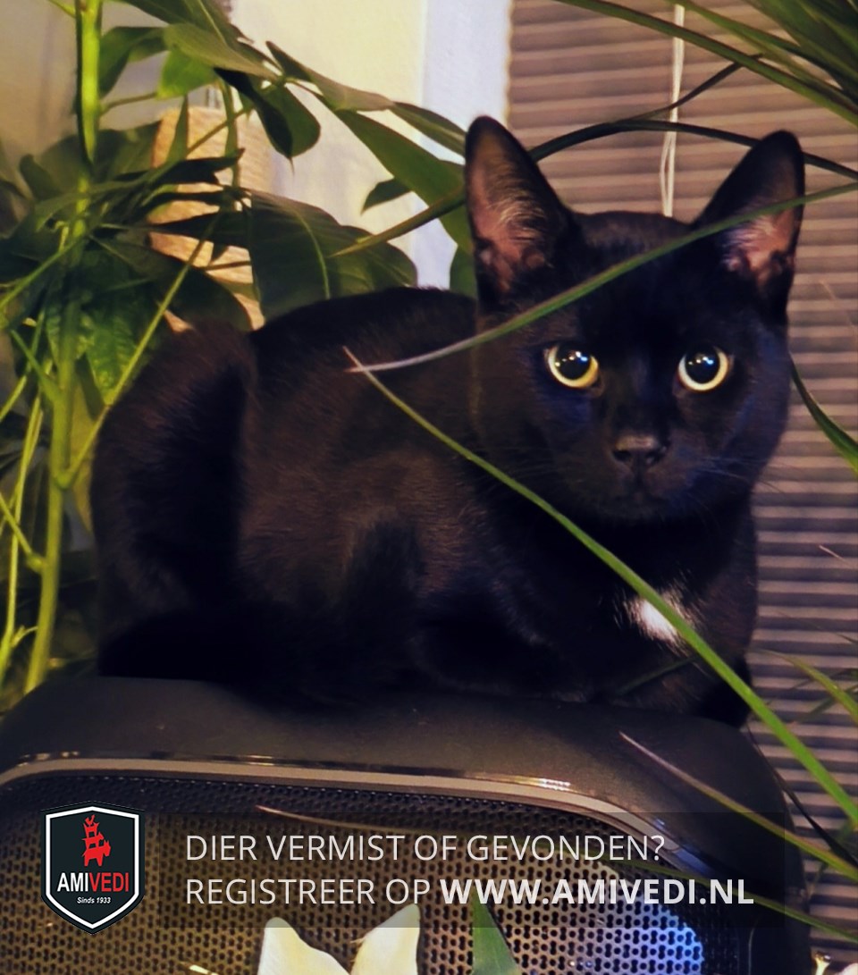 | Signalement | Volledig zwart met wit vlekje op de borst. |