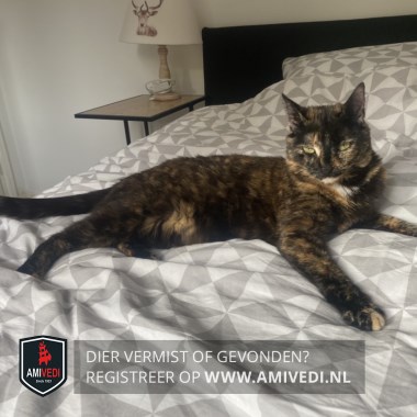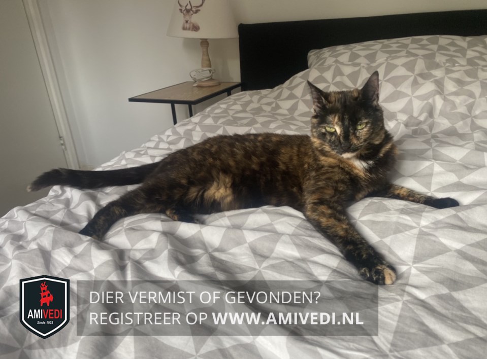 | Signalement | Schildpad, kleurschakering zwart-rood/oranje-crème. Links van het rechteroog een crème kleurig verticale streepje. Lichte kin en een paar lichte plukjes op de bef. Rechter voorpoot heeft 2 crème kleurige teentjes. Crème kleurige vlek op de buik. Slanke poes. |