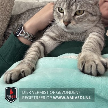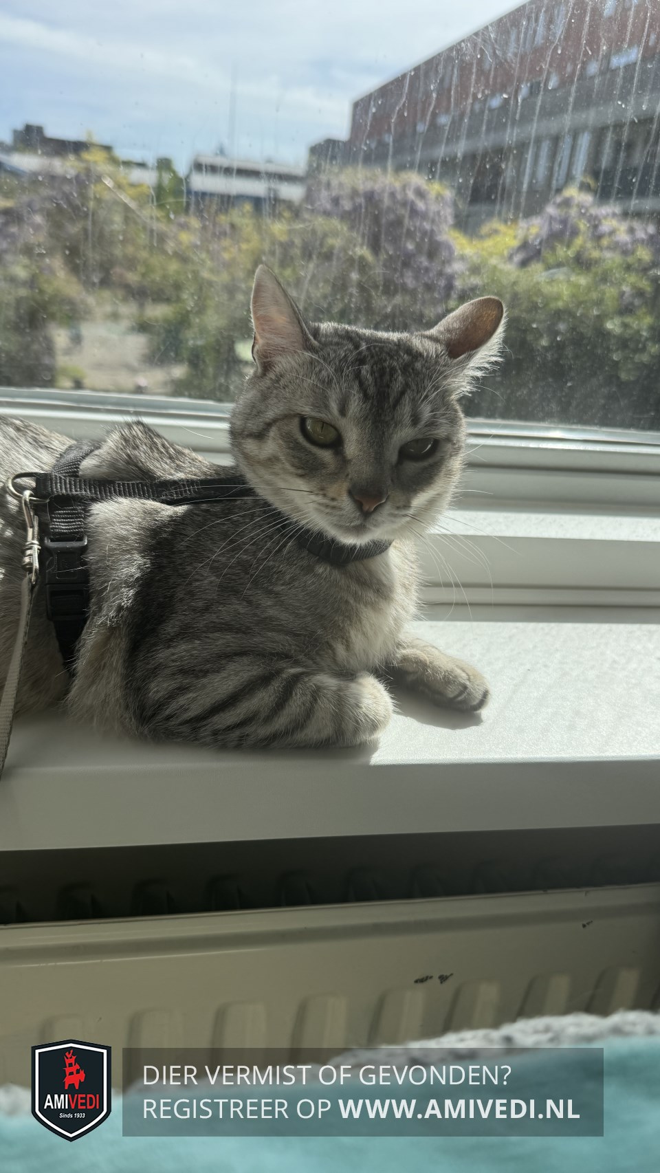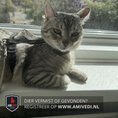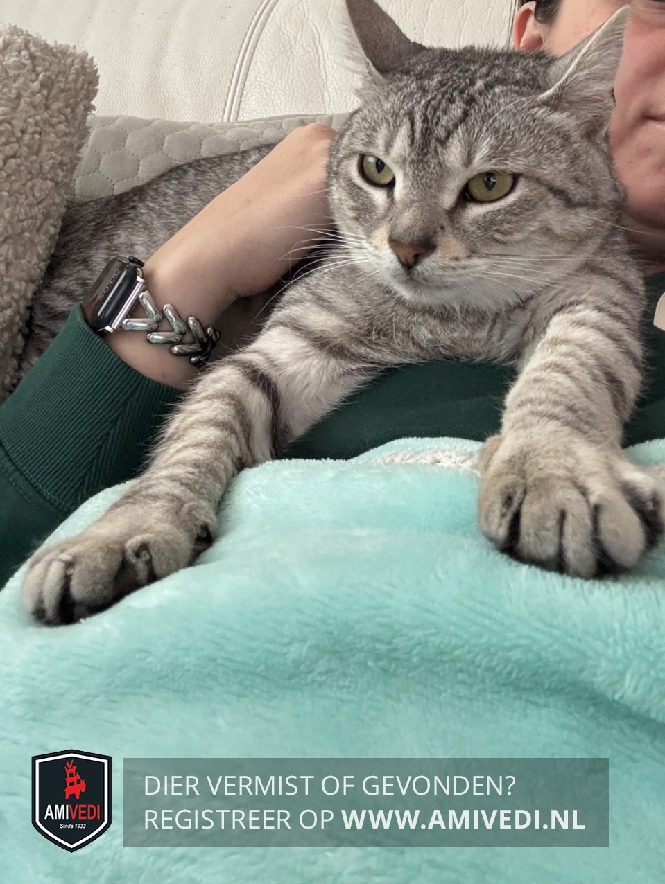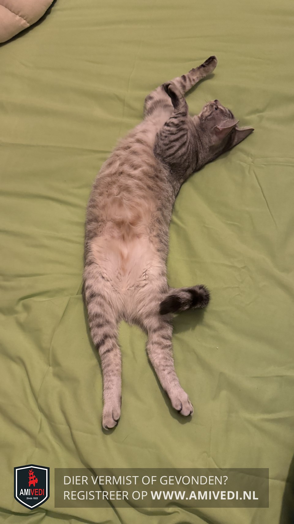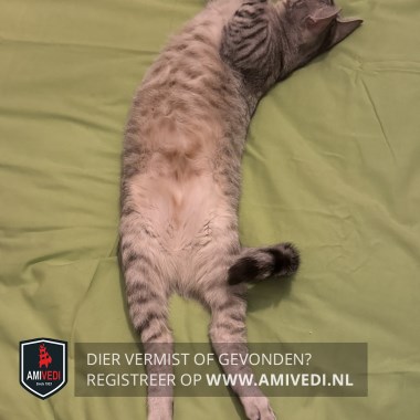 | Signalement | Cypers grijs zwart gestreepte kater met wat wit aan de bek en kin. Lijfje is lichtgrijs / zwart gestreept in een lichte kleur, gestreepte buik met tussen de achterpootjes lichtgrijs haar. |