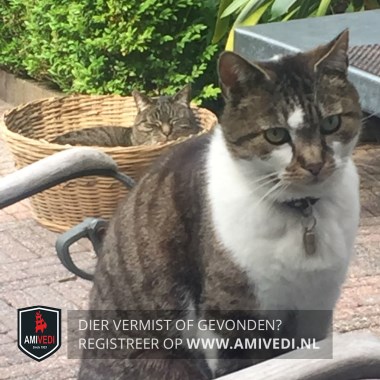| Signalement | Cypers bruin-zwart met wit plekje op voorhoofd witte snuit met bruin op neus en bekje, witte kin, bef, borst en buik, witte voetjes, slechtziend. |