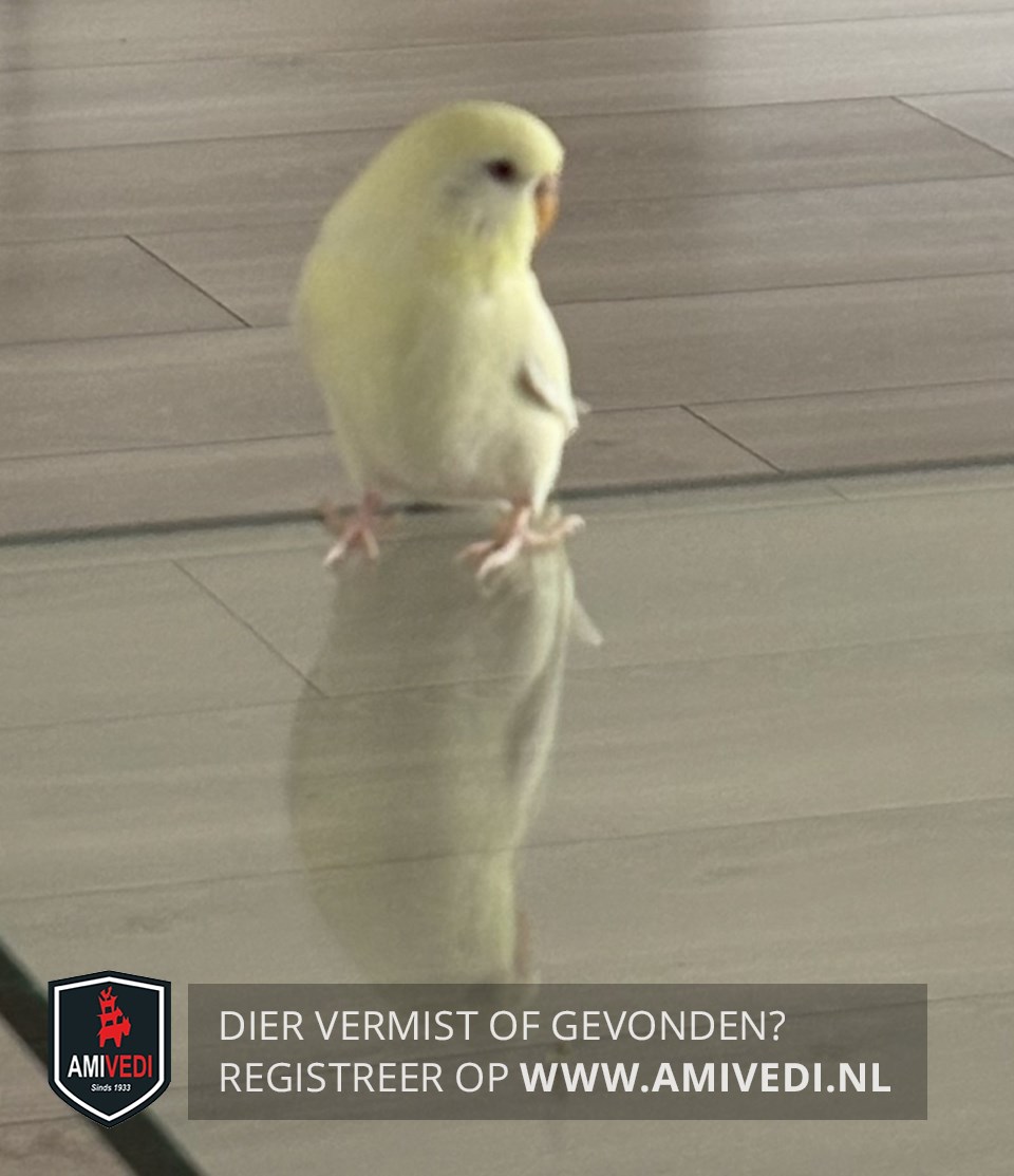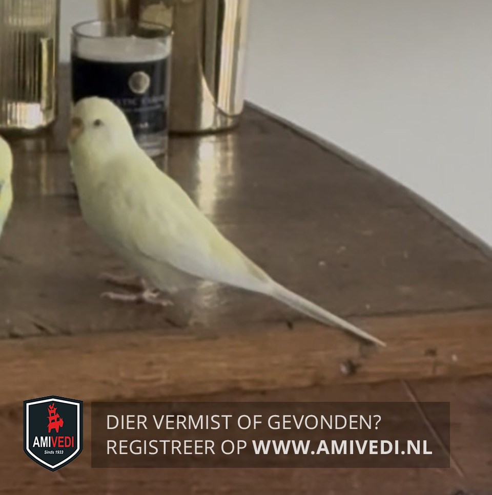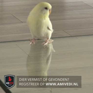 | Signalement | Parkiet, geel. Zwarte oogjes met licht bruine snavel |
