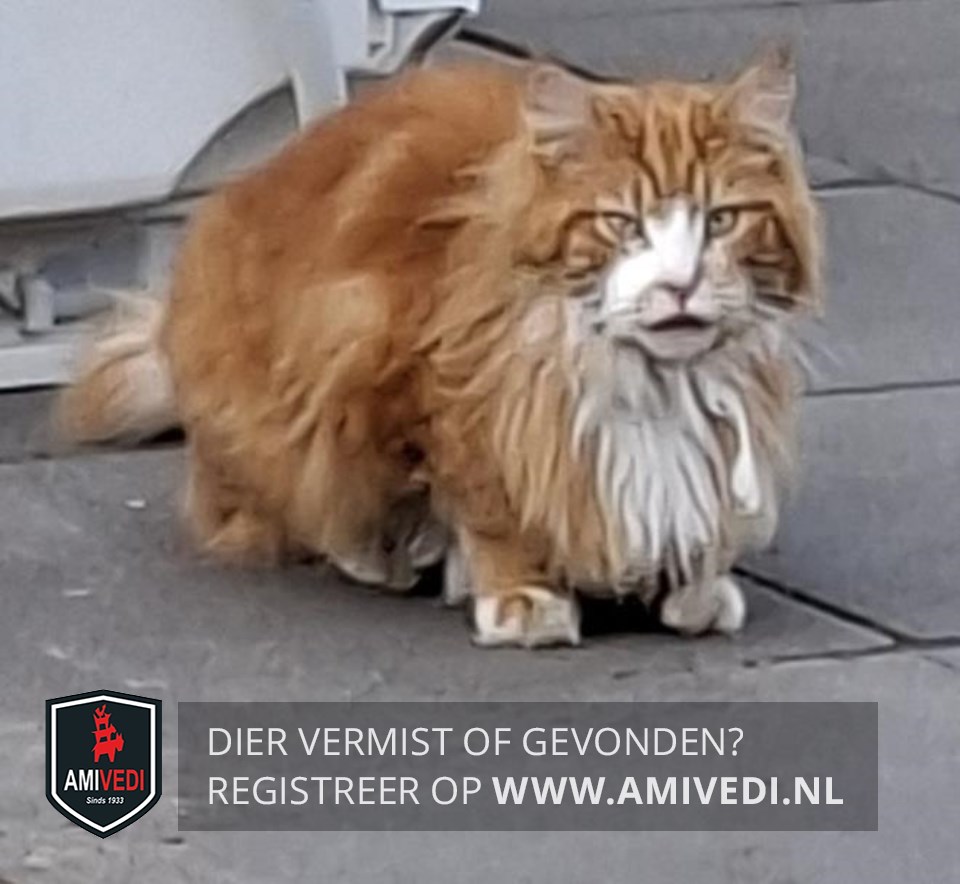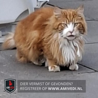 | Signalement | Main Coon kruising, heeft nierproblemen. Cypers oodbruin gemarmerd met wit Witte snoet, witte kin, witte borst, witte teentjes voor met rechts voor in het wit een rood vlekje, witte sokken achter. |