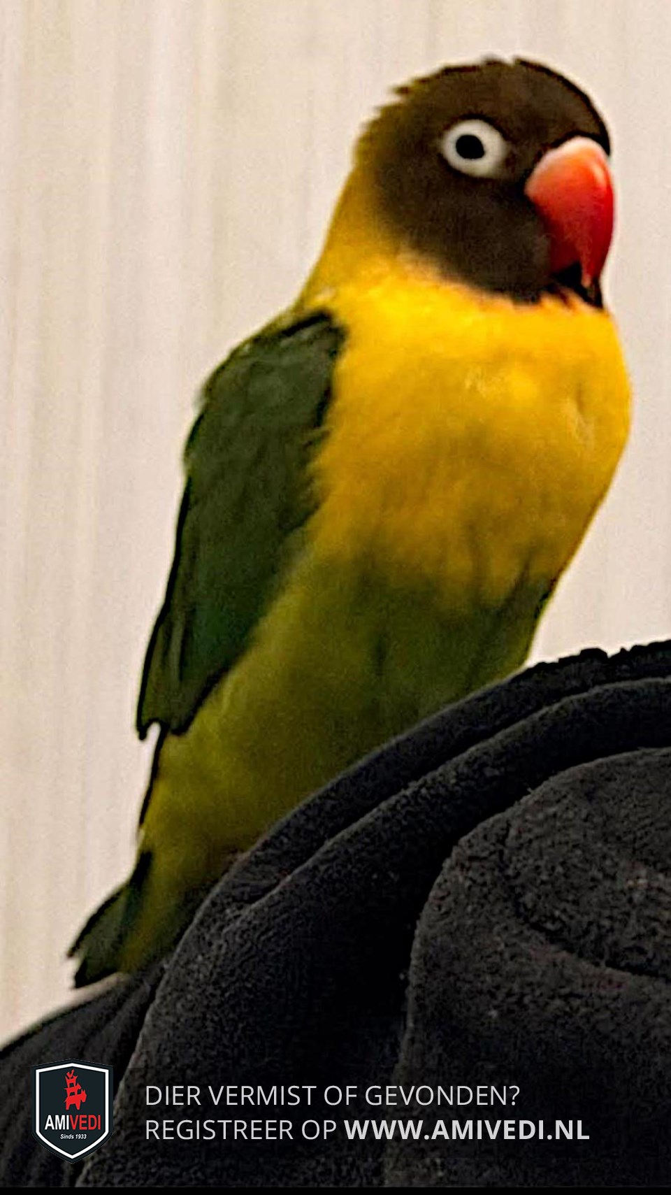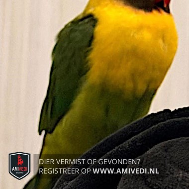 | Signalement | Zwartkop agapornis. Rode snavel, zwart kopje met witte rand om het oogje, gele borst, donkergroene vleugels, lichtergroen rugje en buikje, groene staart. |