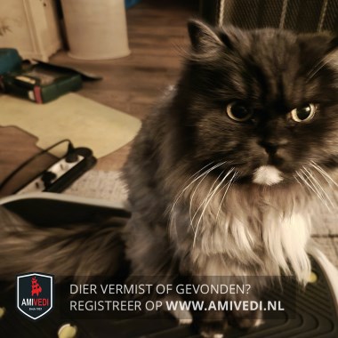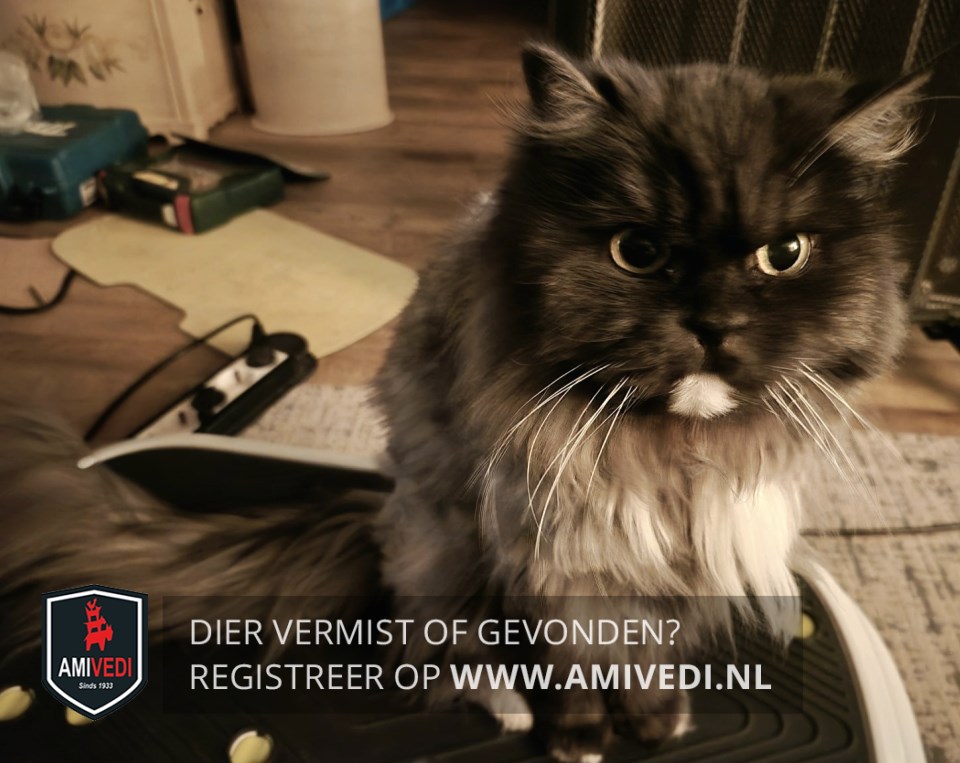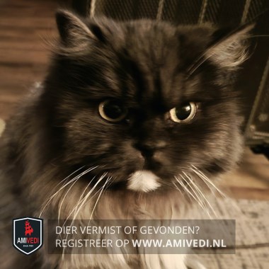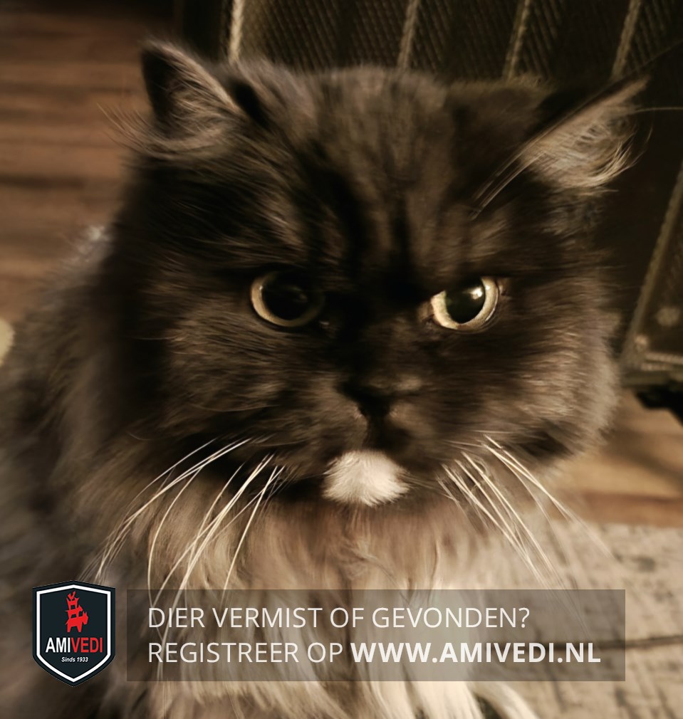 | Signalement | Senior langhaar kruising Pers. Zwart-wit gemêleerd. Zwarte kop met witte kin. Lijf witte ondervacht met zwart gemêleerd. Rug en buik kort geknipt. Heeft pijnstillers nodig! |
