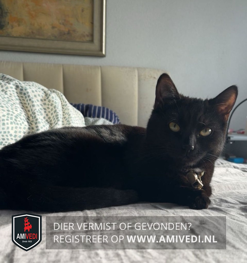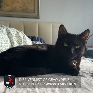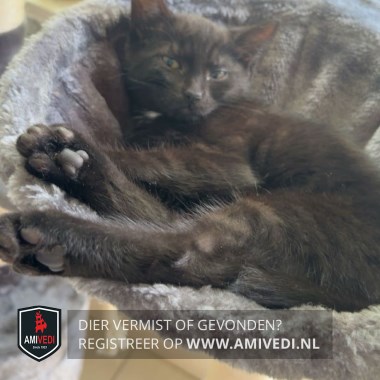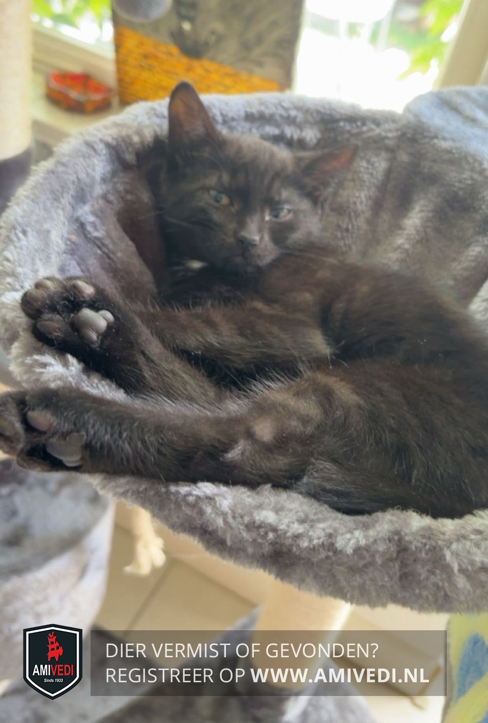 | Signalement | Geheel zwart poesje. Vrij schuw, normaal gesproken niet aanhalig behalve als ze honger heeft. |