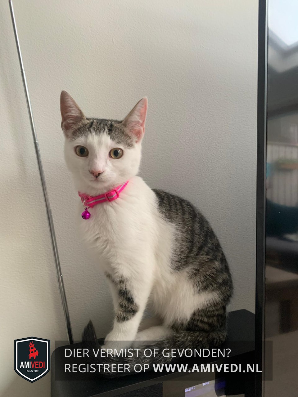 | Signalement | Cypers grijs (zwart) gestreept met wit, cypers grijs op kop, gele ogen, witte snoet, wit bruin vlekje bij neus/bek, witte kin, witte bef, witte borst, witte voorpoten met cypers grijs (zwarte) aftekening, cypers grijs (zwart) op rug en flank, witte op flank, wit op buik, wit op achterpoten, gestreepte staart met zwarte staartpunt, heeft vaak wat vieze ogen. |