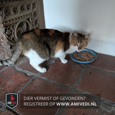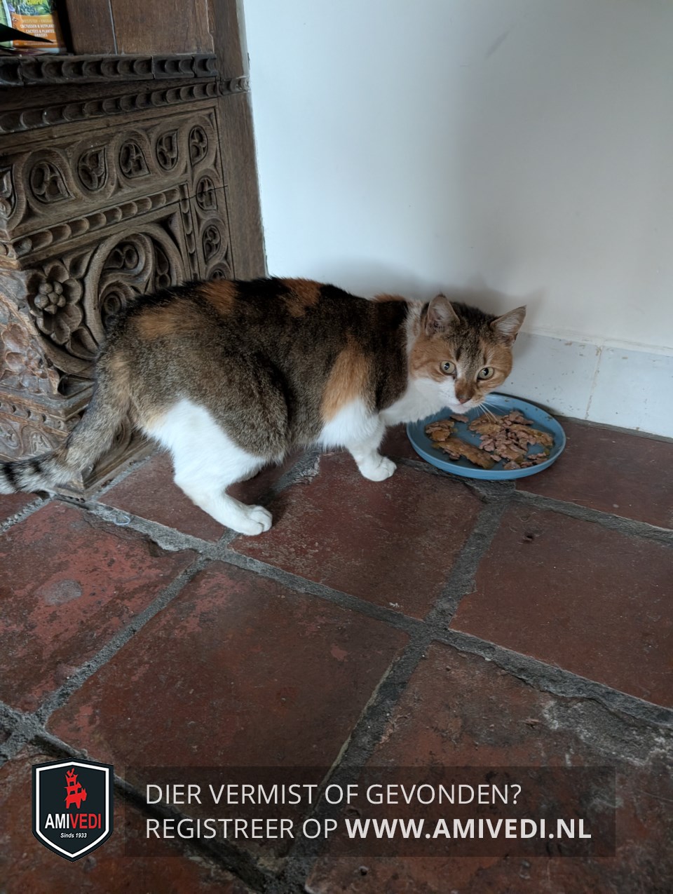| Signalement | Bruin met rood/oranje vlekken en met wit. Bruin bovenop de kop en over de neusbrug. Rood/oranje zijkanten kop en onder linker oog. Wit onder rechteroog, onder de neus, kin, bef en borst. Witte rand over de nek. Bruine rug met rood/oranje vlekken. Bruine staart. Witte pootjes. Redelijk volle poes. |