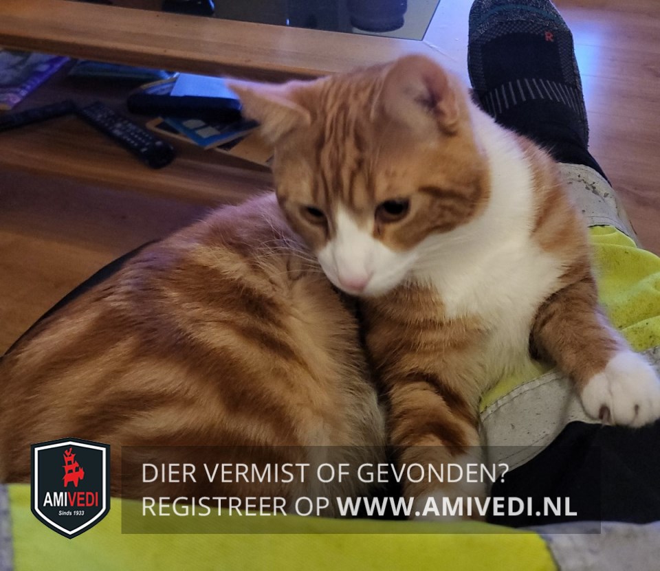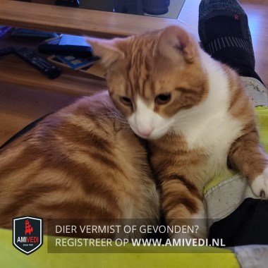 | Signalement | Cypers rood/ oranje gemarmerd met wit. Wit snuitje, hals, bef, borst, voetjes. Op kin een klein rossig vlekje. |