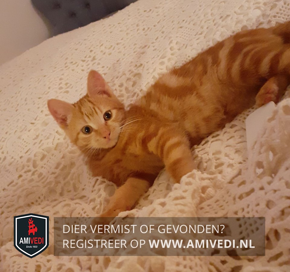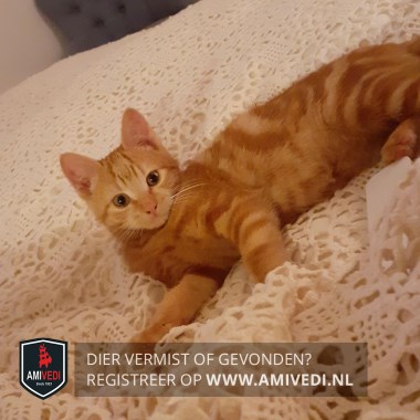 | Signalement | Geheel cypers rood/beige gemarmerde kater. Slank en fijn gebouwd. |