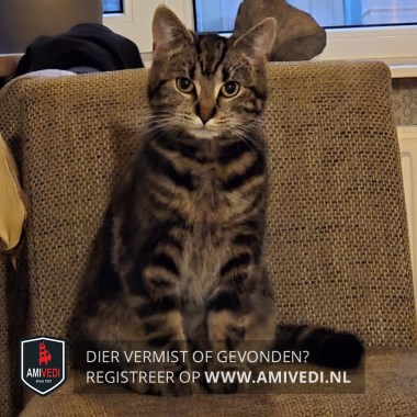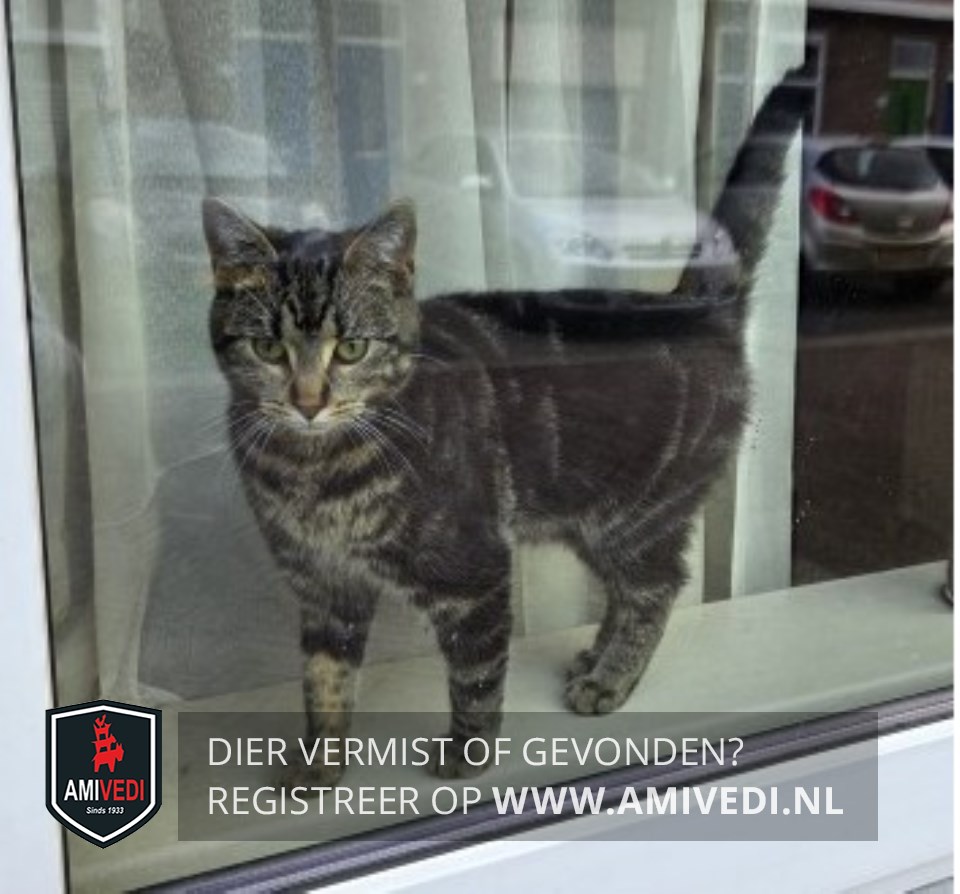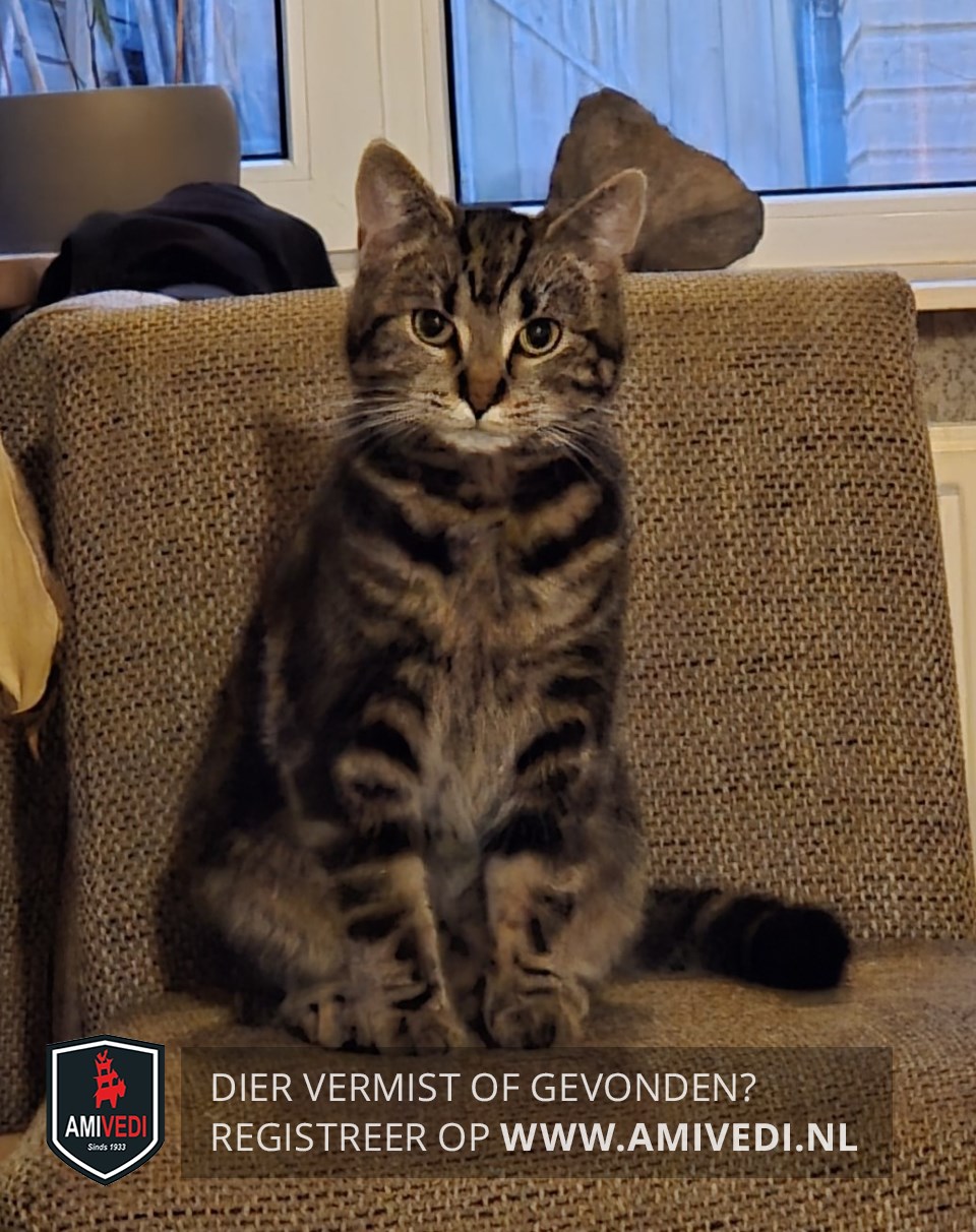 | Signalement | Europese korthaar: bruin/zwart/ wit. Wit kinnetje, met onder het neusje links/rechts kleine witte vlekjes. Witte snorhaartjes met bruin neusje. Binnenkant linker/rechter oogjes witte streep. Zwarte ringen op de staart die uitloopt naar zwarte punt. |