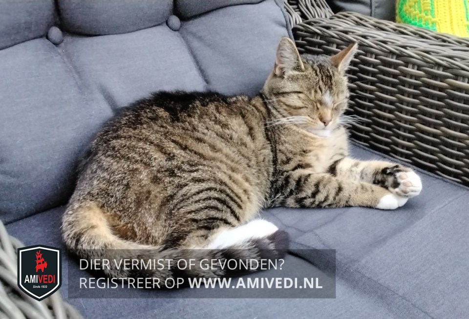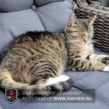 | Signalement | Cypers bruin/grijs/zwarte poes. Beetje wit boven het neusje. Lichtbruin neusje. Beige op de lippen. Wit/beige op de kin. Voorpootje witte teentjes, achterpootjes witte kniekousjes. De staart is beige/grijs met halve zwarte ringen. Erg bang en wil niet benaderd worden. |