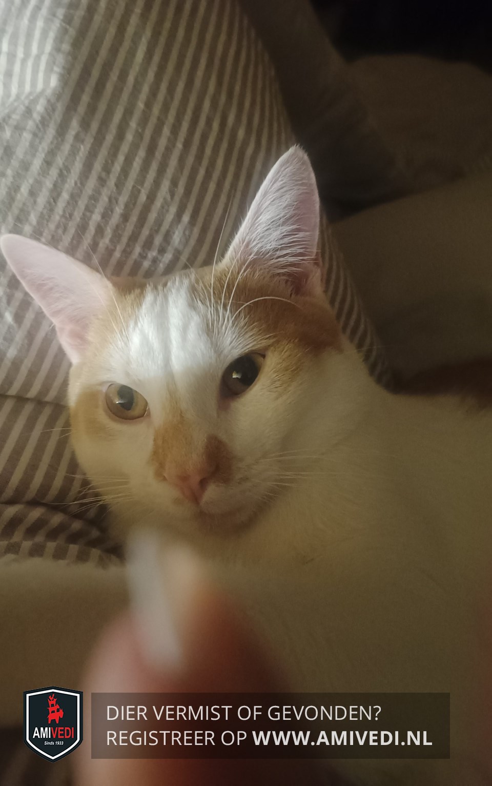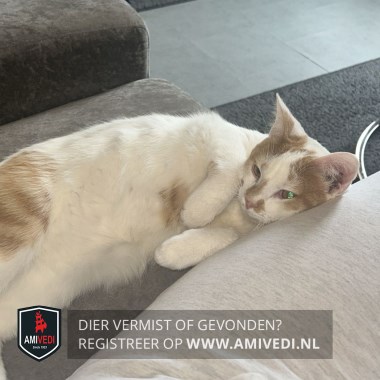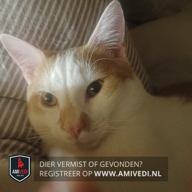 | Signalement | Voornamelijk wit met rood/oranje vlekken. Rechts en links onder de oren voorzijde kop rood/oranje vlekken. Rood/oranje vlek rechts op de neusbrug boven en op de neus. Links van de neus een rood/oranje vlekje. Witte kin, bef, borst en buik. Op de borst een rood/oranje vlek. Witte nek, rug en zijflanken. Op rechter dijbeen rood/oranje vlek. Rood/oranje ringstaart. Witte poten. |