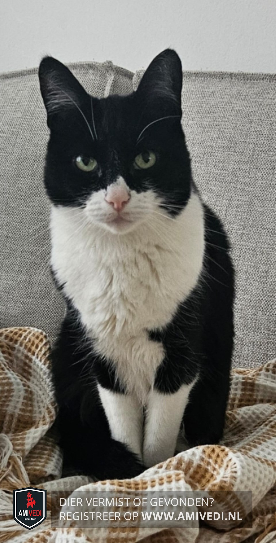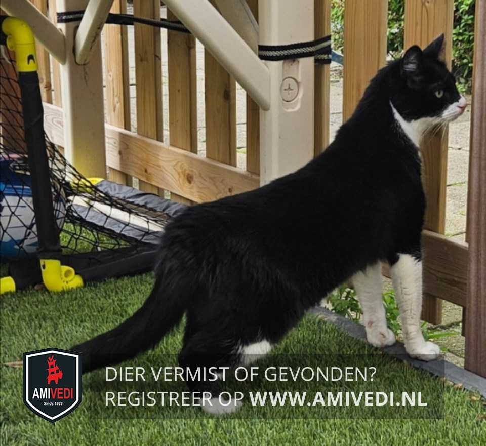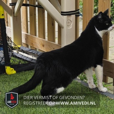 | Signalement | Slanke kater. Witte voorpoten, achter witte voetjes. Witte snoet en borst, doorlopend naar onderkant |