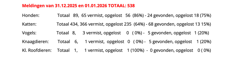 Goed nieuws: er zijn minder honden en knaagdieren vermist geraakt. Helaas geldt dit niet voor katten. Wel zijn er meer dieren herenigd met hun baasjes. Ook zagen we iets minder meldingen rond 13 en 14 december.