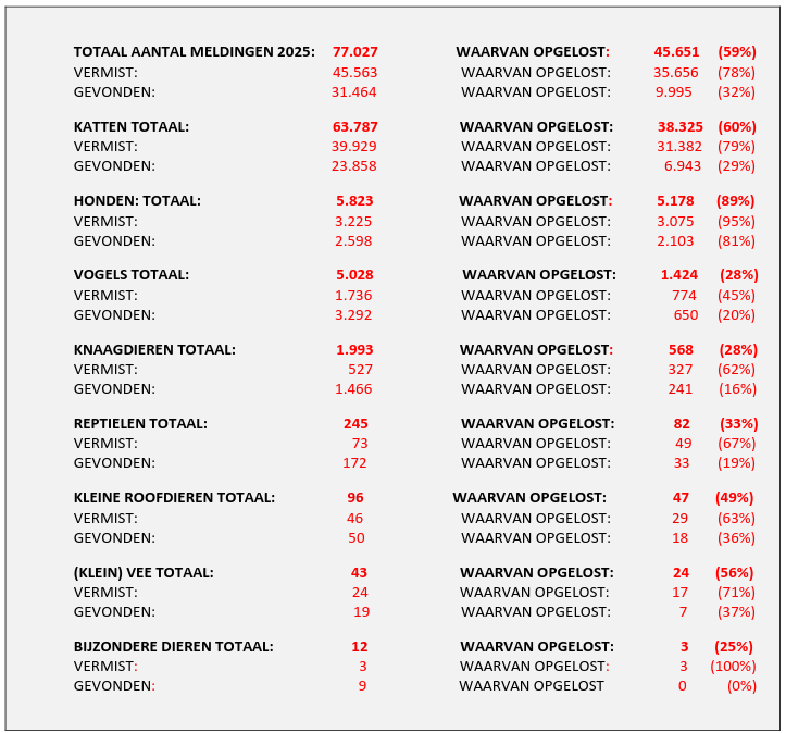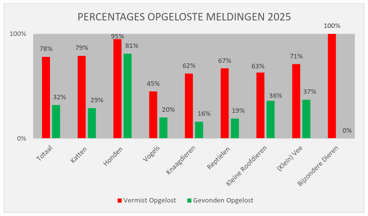 Van de vermiste dieren werd in totaal 78% opgelost. Van de vermiste honden werd in 2025 95% opgelost. Bij de vermiste katten is percentage gestegen van 77% naar 79%.